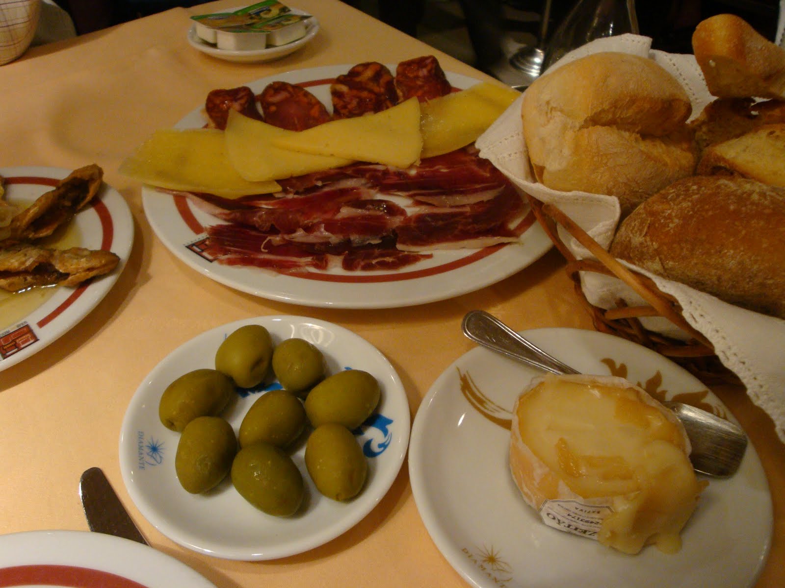 Quase em todos restaurantes portugueses, assim que sentamos à mesa, são colocados os aperitivos. No mínimo pão, manteiga e azeitonas. A atitude mais sensata, pelo menos na maioria das vezes, é recusá-los. Isto porque eles pesam – no estômago (já que os pratos individuais são geralmente muito fartos) – e no bolso também. N’O Fialho em Évora, por exemplo, só o pratinho de presunto cru (maravilhoso, diga-se de passagem) acrescentou 15 euros (!) na conta final. Abaixo, uma típica mesa farta de aperitivos.