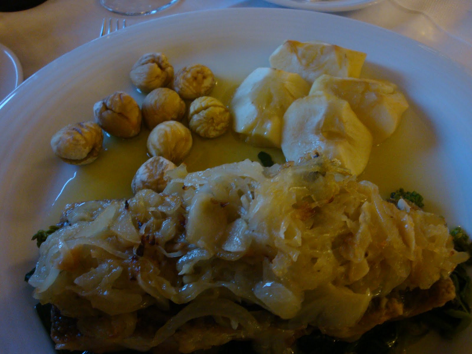 O outro restaurante digno de nota da viagem foi O Alcaide, na cidade de Óbidos. Também um restaurante familiar, o dono entendia muitíssimo de vinhos e tinha uma carta de vinhos enorme, que além dos rótulos vinha recheada de poemas e ditados sobre a bebida 🙂 A indicação do vinho, safra de 2003, foi a dedo e agradou muito. Aqui comemos o melhor prato da viagem, um fantástico polvo a lagareiro. O bacalhau recheado com queijo da Serra e acompanhado de maçãs e castanhas assadas estava divino também. O único senão do lugar foi a falta de boas sobremesas portuguesas.