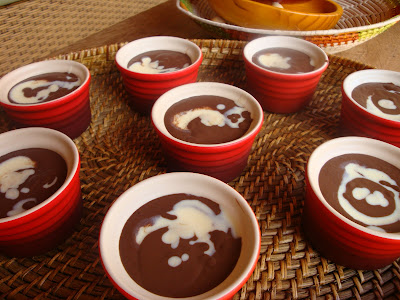 Mesmo não sendo super fã de chocolate e de doces feitos com ele, sou voto vencidíssimo em casa. Pelo que esta receita do livro Cozinhando para amigos da Heloísa Bacellar fez o esperado sucesso, servida como sobremesa de um churrasco. Nestes potinhos o creme de chocolate é cozido e não assado como nos famosos chocohotpots da Nigella. A textura fica mais cremosa. E a mistura dos dois chocolates dá um gostinho especial.